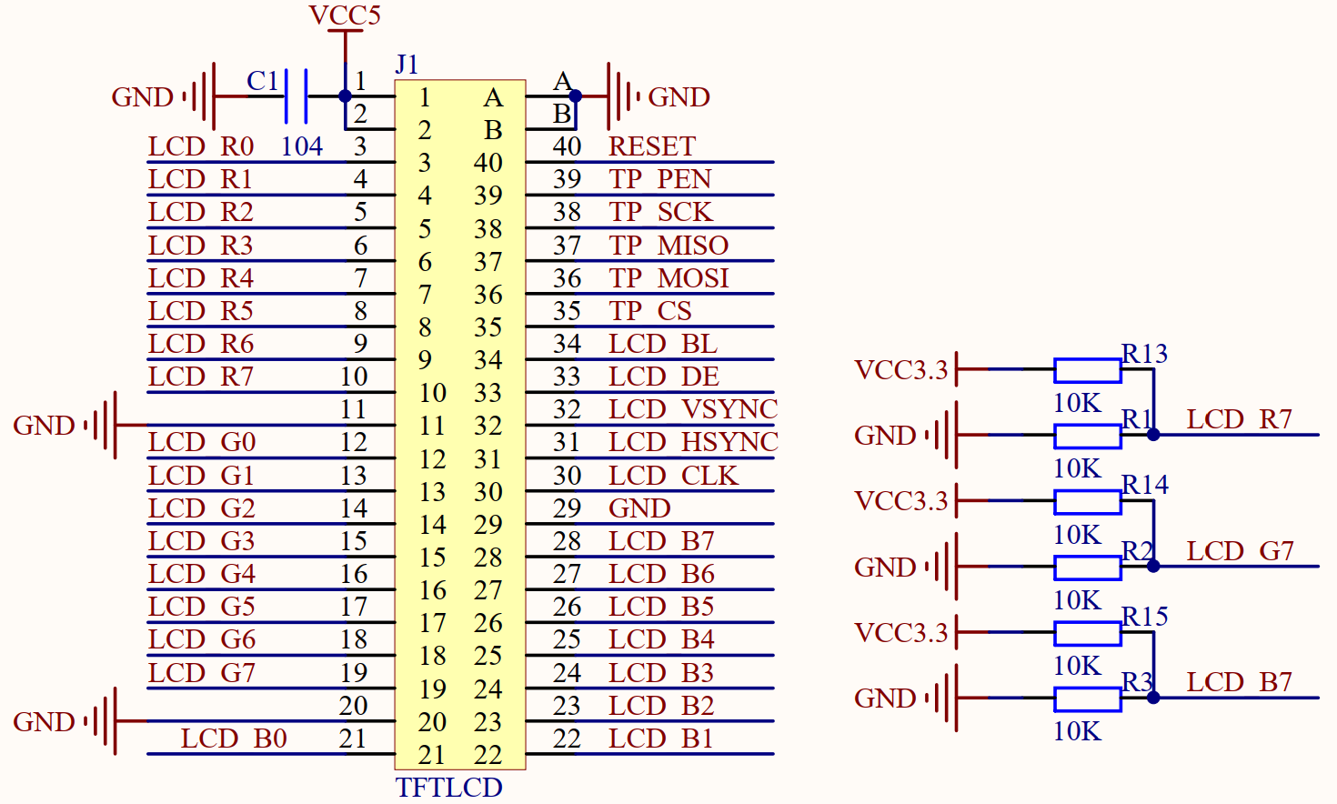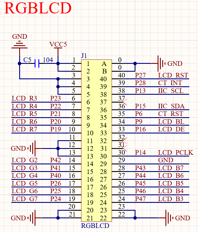 图中J1就是对外接口,是一个 40PIN 的 FPC 座( 0.5mm 间距),通过 FPC 线,可以连接到T5小系统板的RGBLCD接口上面,从而实现和T5的连接。该模块的接口十分完善,采用 RGB888 格式,并支持 DE&HV 模式,还支持触摸屏(电阻/电容)和背光控制。