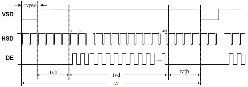 图中的VSD就是垂直同步信号LCD_VSYNC,HSD就是水平同步信号LCD_HSYNC,DE为数据使能信号。