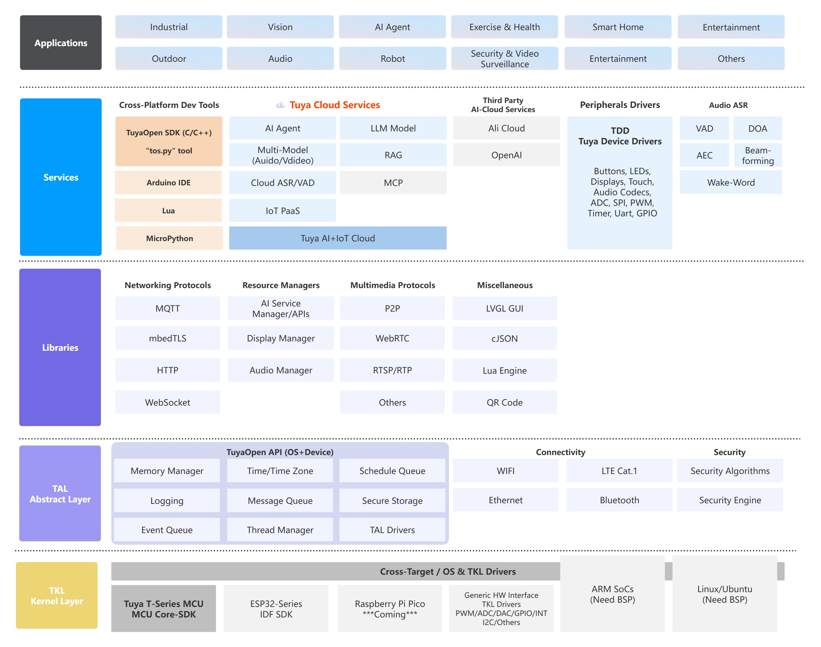 - TuyaOpen API(OS+Device)功能组件:提供系统级核心接口,涵盖内存管理、日志、事件/消息/调度队列、时间/时区管理、线程管理、安全存储、TAL 驱动等,支撑上层的并发、存储、调度等基础能力。