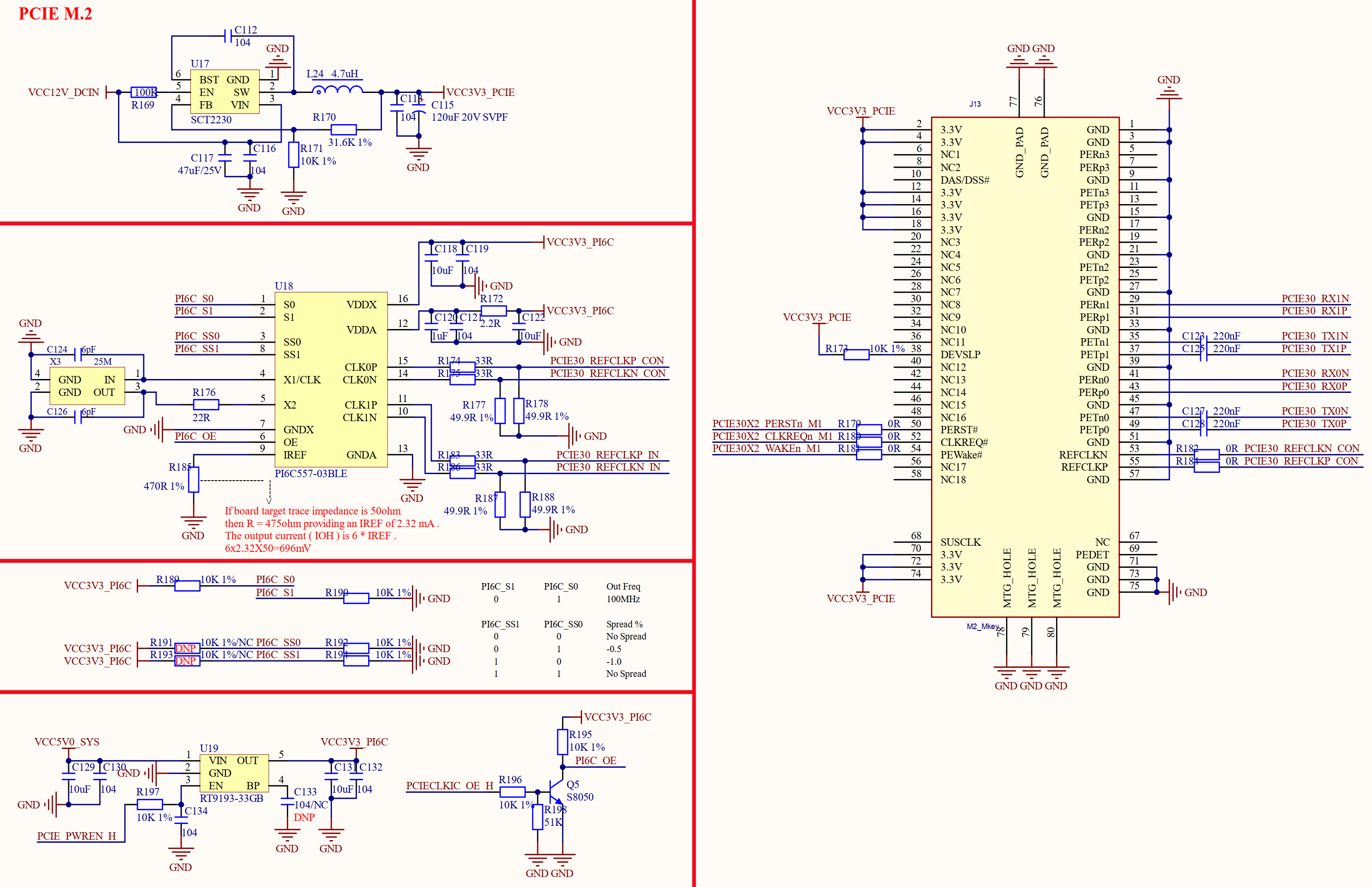 图3.30.1中J13就是PCIE SSD接口,为M.2 B_Key接口类型。可以连接常用的2280 M.2 SSD固态硬盘。U18这个PI6C557-03BLE是PCIE时钟芯片。U17是一个DCDC电源芯片,给PCIE提供一路专用的3.3V电压。U19是一个LDO电源芯片,提供一路3.3V电源给PCIE时钟芯片。