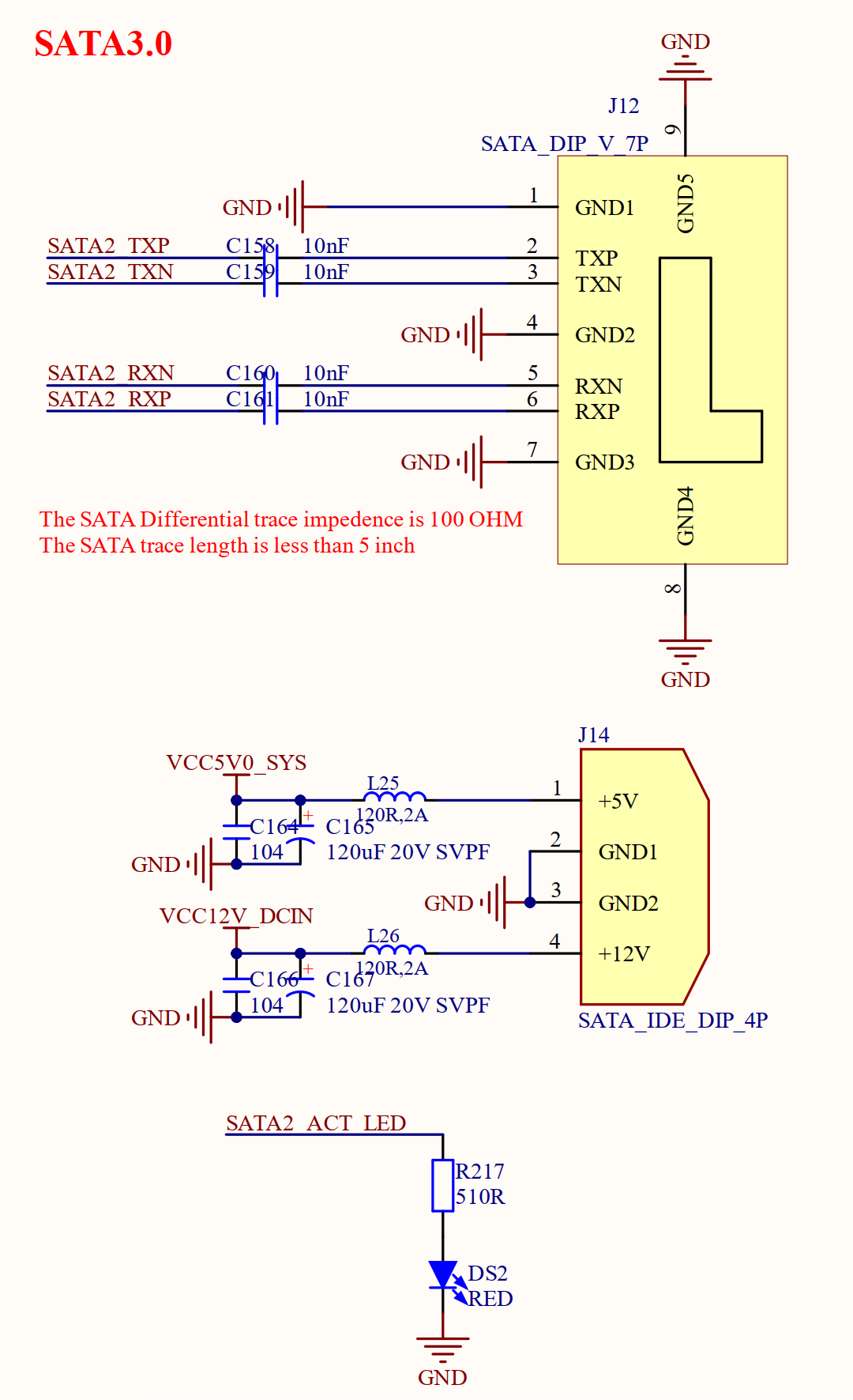 图3.9.1中J12是SATA硬盘接口,用于连接SATA硬盘,J14是硬盘的电源接口,用于给硬盘供电。