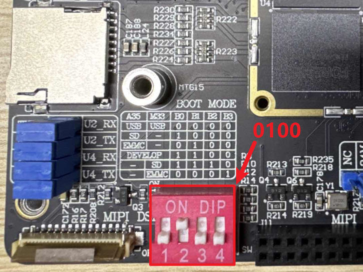 ATK-DLMP257B开发板使用一根USB Type-C连接线,连接底板上的UART接口,出厂时已经把Linux系统烧写到核心板上的eMMC存储上了。所以我们将拨码拨至0100(BOOT0~BOOT3),如下图,拨码向上表示为“1”(ON),向下表示为“0”(OFF)。