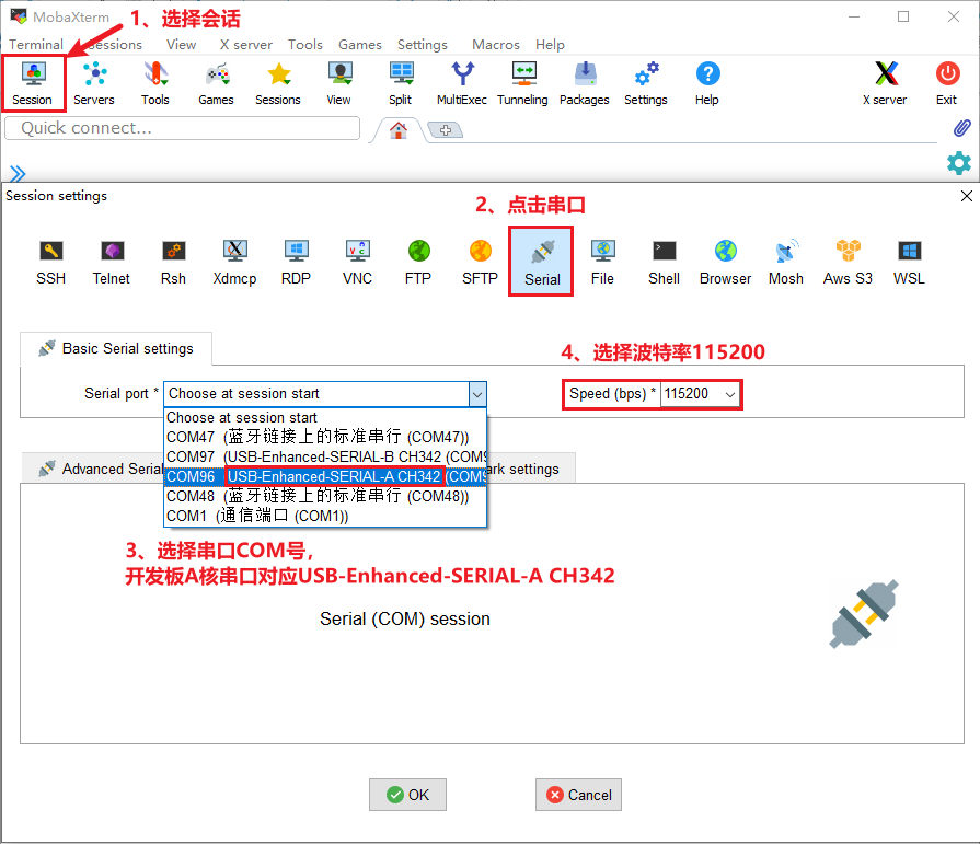 开发板插上DC12V直流电源,MobaXterm选择为串口类型,按如下设置。请选择相应的COM口(COM口是PC(电脑)识别开发板UART的串口号。如果此时开着虚拟机,请注意串口是否在等待选择连接或者已连接到虚拟机上,需要将串口切换连接到Windows端)。开发板使用CH342芯片将一路串口分为两路: