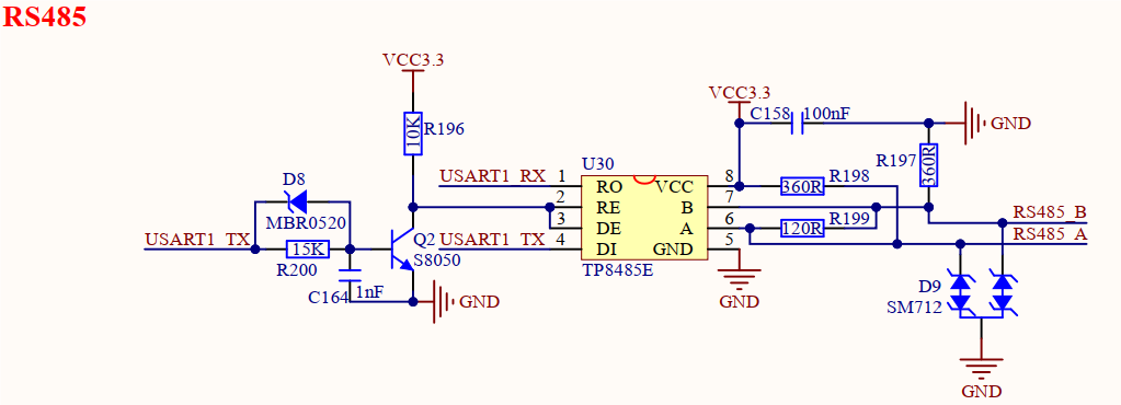 开发板使用TP8485E芯片实现RS485通信功能,其他型号RS485芯片均可。RS485设备通信时,需要板载端口RS485_A接对方设备端口A,板载端口RS485_B接对方设备端口B。该电路中,通过将TP8485E芯片RE和DE引脚连接到USART1_TX引脚上,实现RS485接收和发送状态的自动切换,完全将RS485当做一个串口来使用。需注意的是,这种自动控制RS485收发状态方式,不能过快收发数据,一般建议不超过115200波特率。若需要提升RS485通信速率,则建议使用独立GPIO来控制RE、DE引脚 。该电路添加静电防护器件,提升电路可靠性。